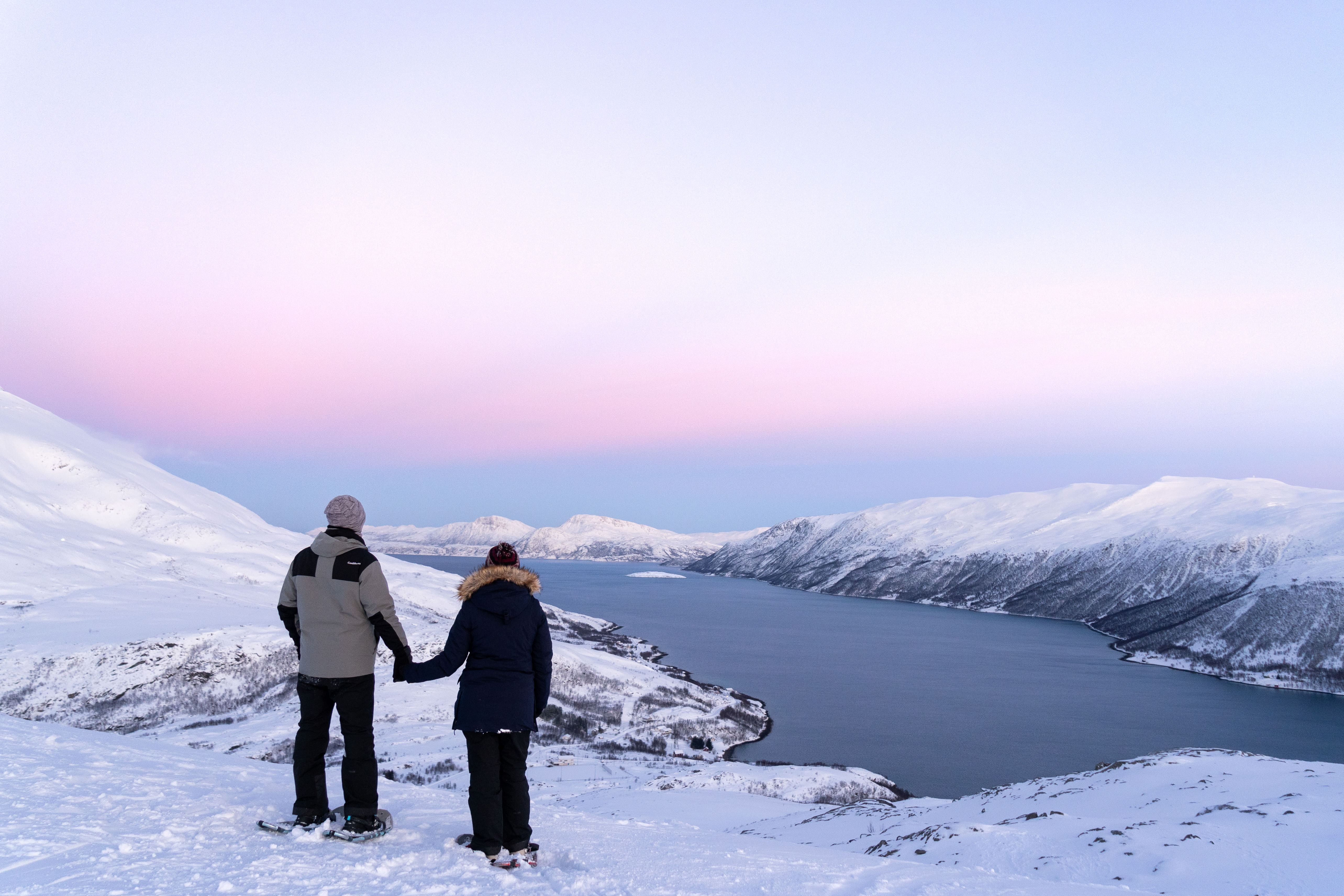 We meet outside Scandic Ishavshotel, where your guide introduces the plan before a short scenic drive into Tromsø’s snowy backyard. After a quick snowshoeing introduction, we head into the peaceful mountains for a 2.5–3 hour hike set at a comfortable pace for everyone.